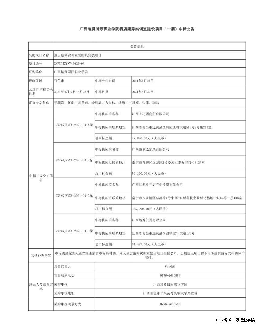 广西彩神国际职业学院酒店康养实训室建设项目(一期)中标公告