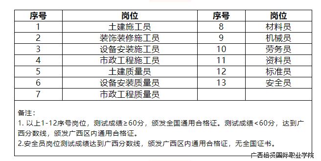 (二)关于证书。土建施工员🧑🏻‍🎤、装饰装修施工员👲、设备安装施工员、市政工程施工员、土建质量员、装饰装修质量员、设备安装质量员、市政工程质量员、材料员👱🏻‍♂️、机械员、劳务员、资料员🚴🏻‍♀️、标准员等13个岗位🥅,测试成绩达60分以上者🈚️,颁发全国通用合格证👴🏻;60分以下,达到广西分数线者,颁发广西区内通用的合格证🚪。安全员岗位达到广西分数线者,颁发广西区内通用的合格证🎀,无全国证。