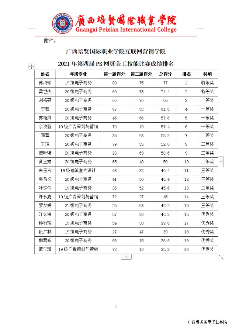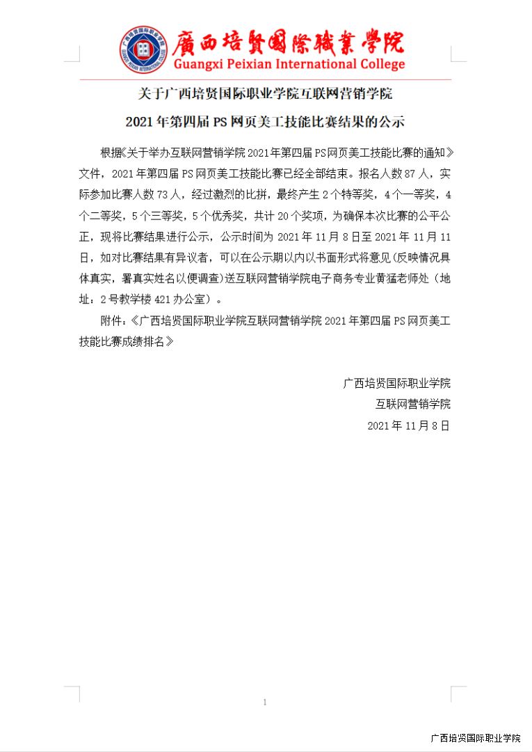 关于广西彩神国际职业学院互联网营销学院2021年第四届PS网页美工技能比赛结果的公示
