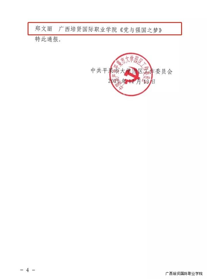 为庆祝中国共产党成立100周年,深化党史学习教育,在中共平果市大学园区工作委员会举办的“感党恩 跟党走 同心共筑中国梦”主题征文比赛中🧑🏻🦰,我校学生荣获一等奖1名✣,二等奖2名,三等奖3名🤸🏽♂️,优秀奖8名🫰。