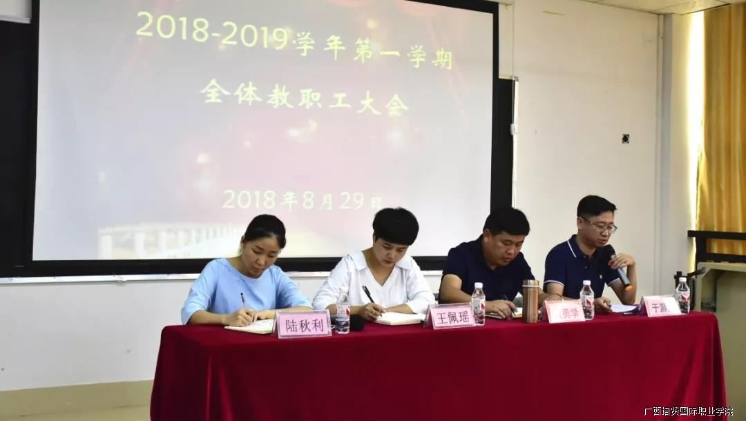 2018年8月29日下午,广西彩神国际职业学院在学术报告厅110召开2018—2019学年第一学期全体教职工大会。董事长助理王佩瑶🧑‍🦳,学院副院长黄勇学、副院长于灏洋🚣🏼,副院长陆秋利出席本次会议。