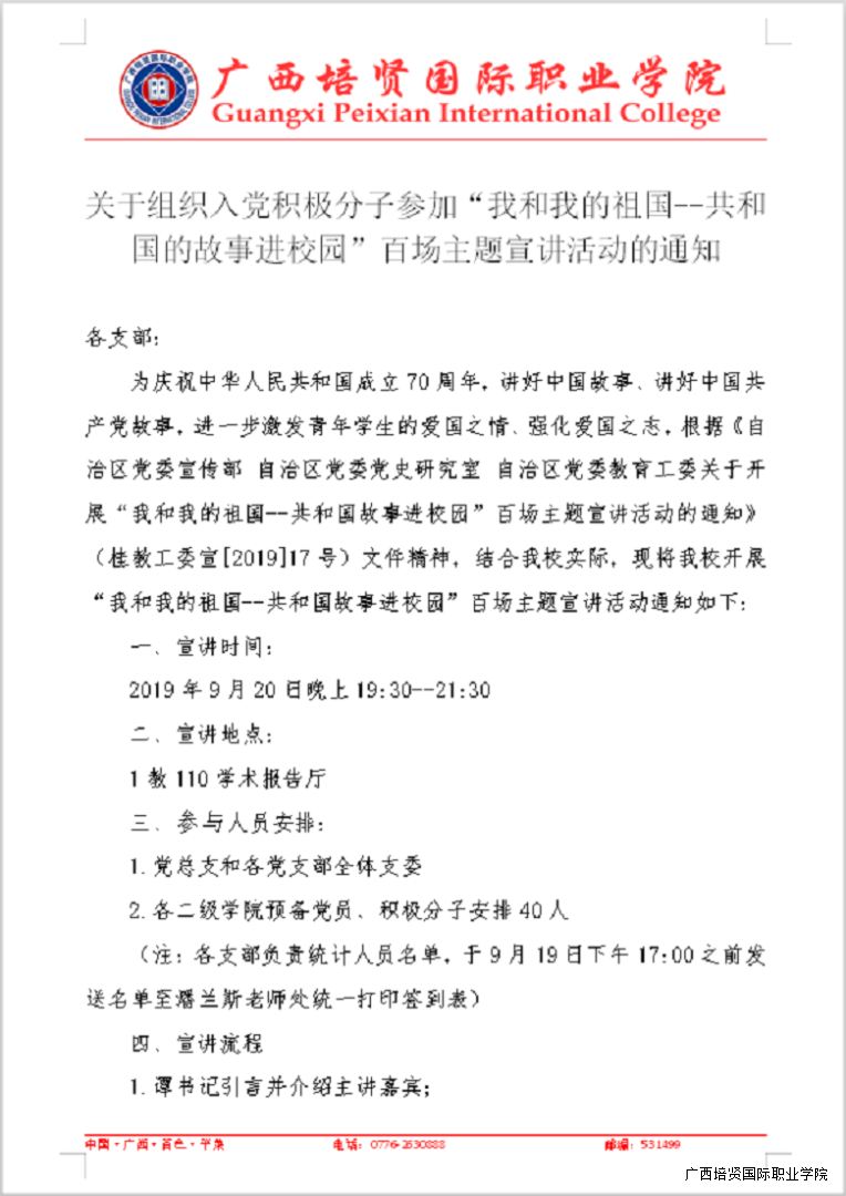 1. 关于组织入党积极分子参加“我和我的祖国--共和国的故事进校园”百场主题宣讲活动的通知