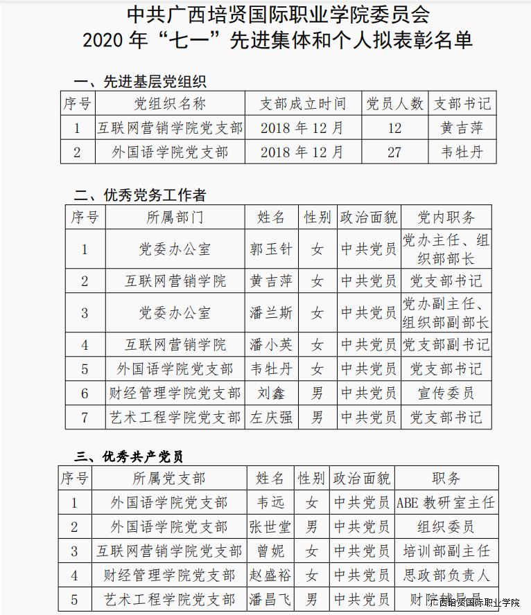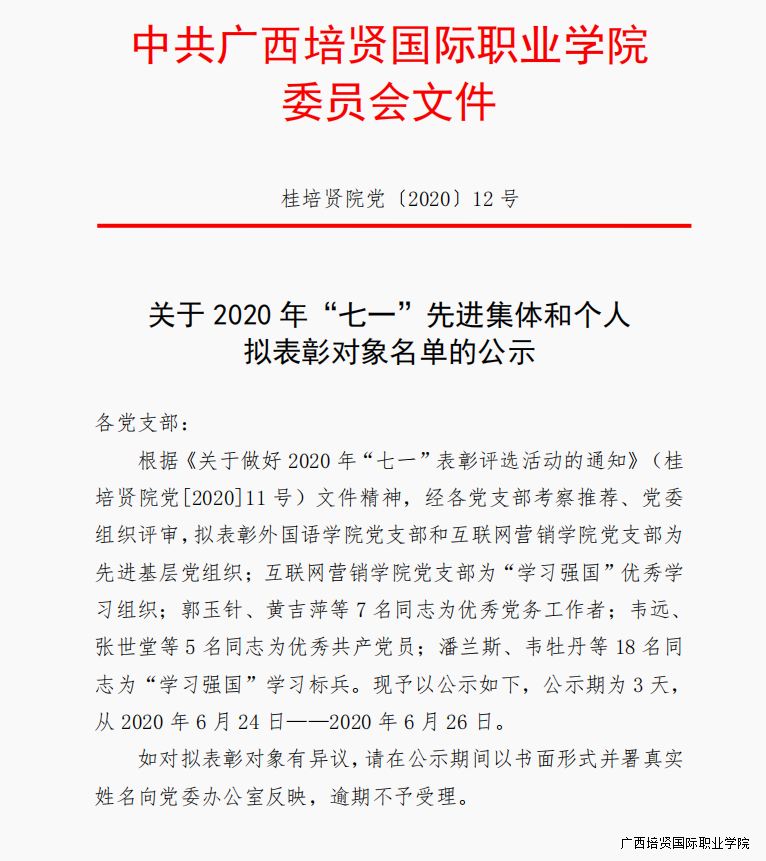 关于2020年“七一”先进集体和个人拟表彰对象名单的公示