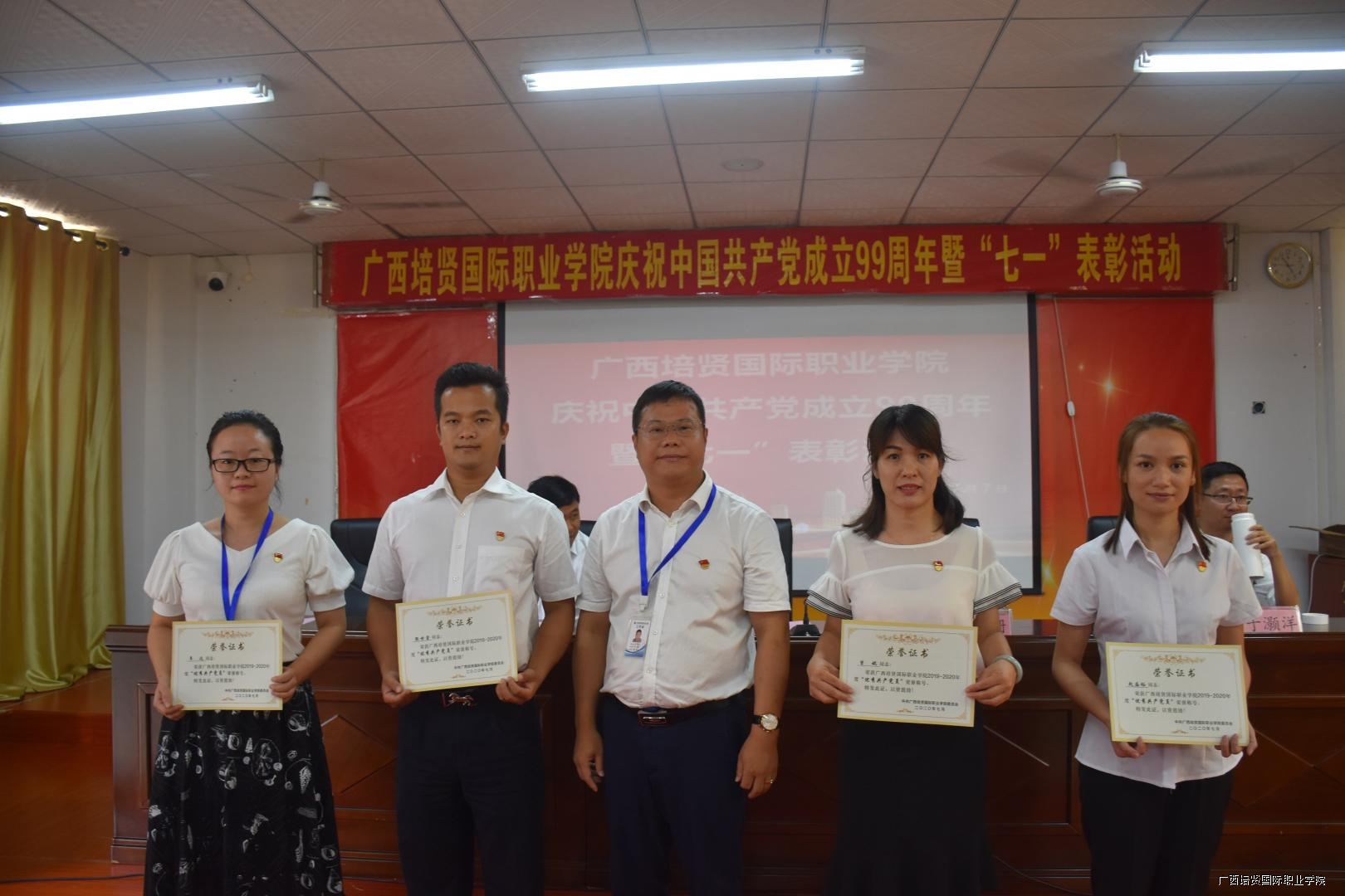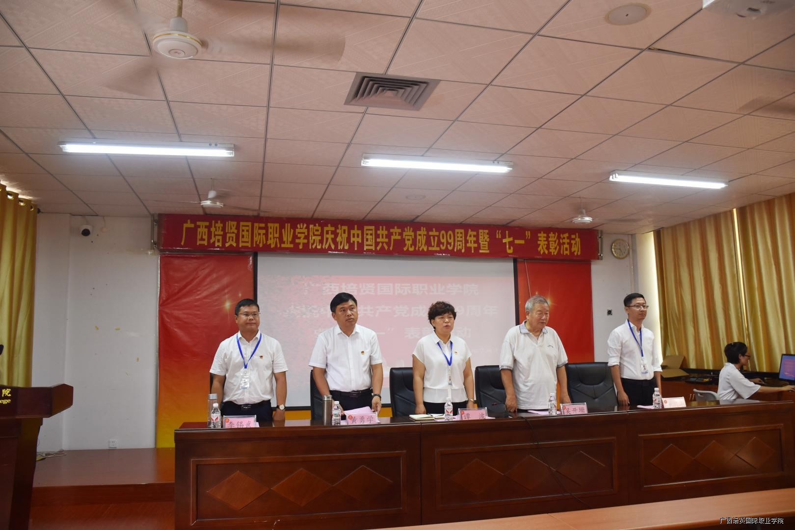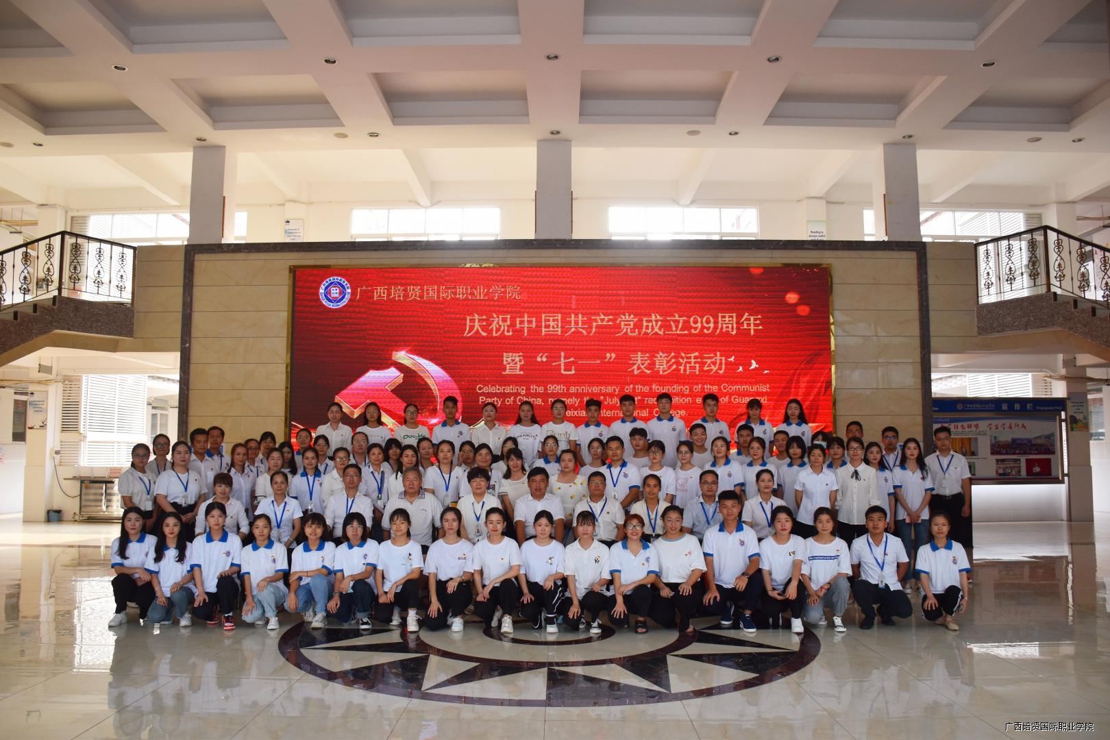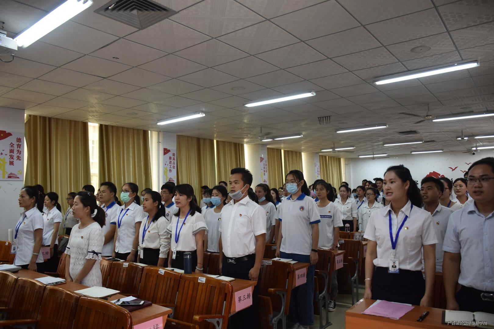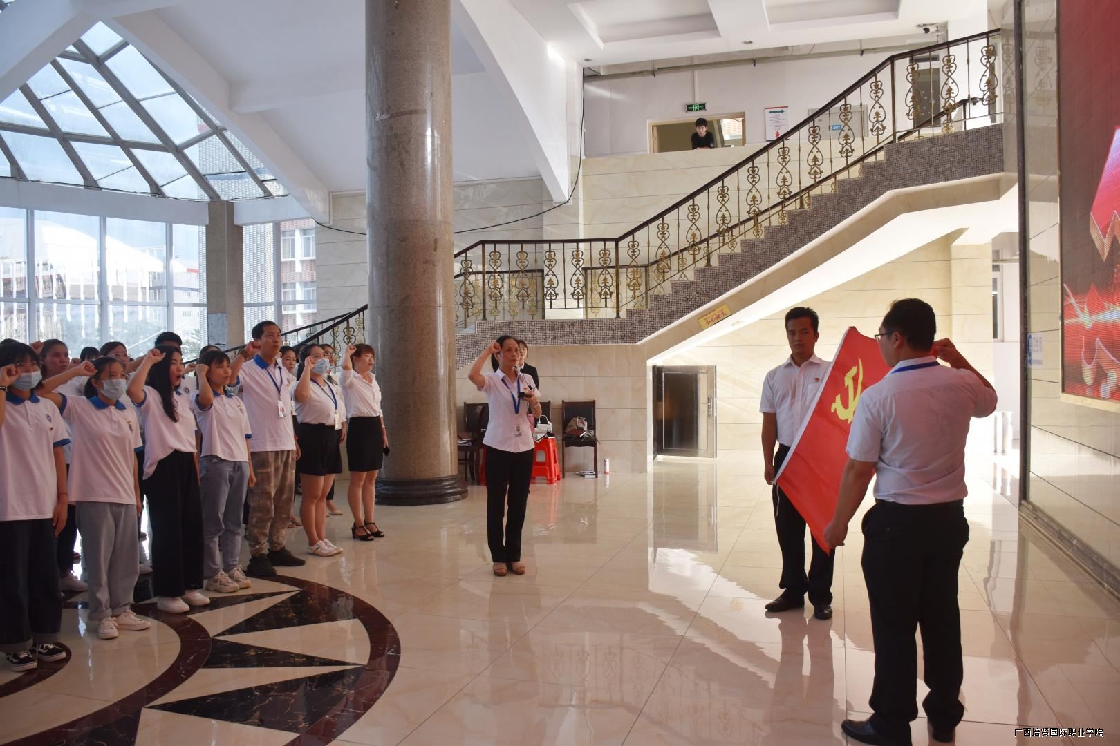 大会的最后一项议程,在我校一栋教学楼大厅,面对着鲜红的党旗,由互联网营销学院党支部书记黄吉萍同志领誓⛑️,新党员进行了入党宣誓仪式,老党员重温了入党誓词,自此🌷,我校庆祝建党99周年暨“七•一”表彰大会圆满落下帷幕。