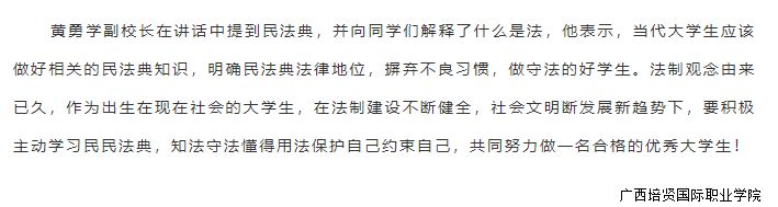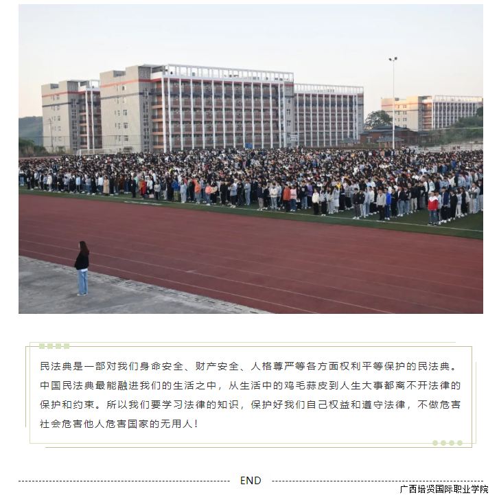 民法典是新中国成立以来第一部以法典命名的法律,被誉为“社会生活的百科全书”和“保障民事权利的宣言书”民法典的诞生将深刻影响每个人的生活🧒🏽。11月9日早上,我校于学校田径场举行了升旗仪式⚁,我校副校长黄勇学、于灏洋、以及各二级学院领导出席本次升旗仪式,学校全体师生共同参加➔,仪式由杨贵婷同学主持。