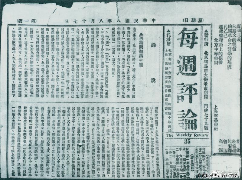 1919年8月17日,李大钊在《每周评论》第35期发表《再论问题与主义》
