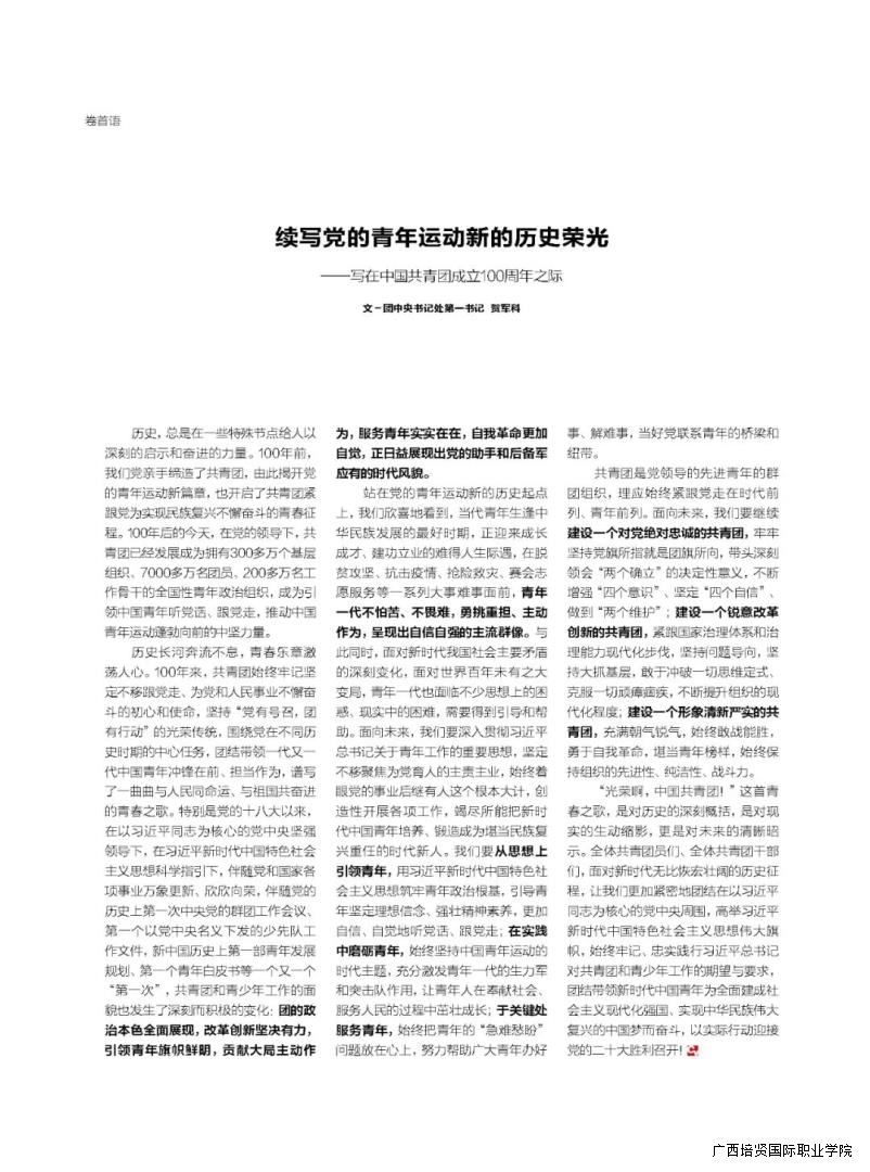 1. 续写党的青年运动新的历史荣光——写在中国共青团成立100周年之际