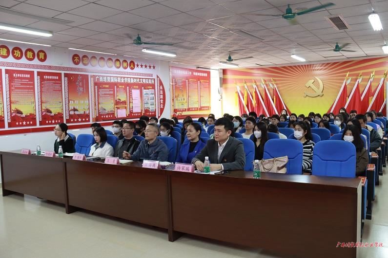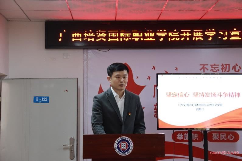 3月1日下午,按照自治区党委教育工委的安排,广西交通职业技术学院党委副书记莫海燕一行来我校开展党的二十大精神宣讲活动。自治区党委教育工委宣讲团成员📩、广西交通职业技术学院马克思主义学院院长⛎、教授周黎华🤹🏻,马克思主义学院教师、副教授周婧婧主讲。广西交通职业技术学院党委副书记莫海燕、我校党委书记👮🏻♂️、督导专员王勇、学校副校长于灏洋🏄🏻♀️、校长助理陈艳秋出席宣讲会🤟🏿🔷,学校机关第五党支部、第二党支部党员师生、师生代表聆听报告,宣讲会由学校党委副书记、副校长许家瑞主持。