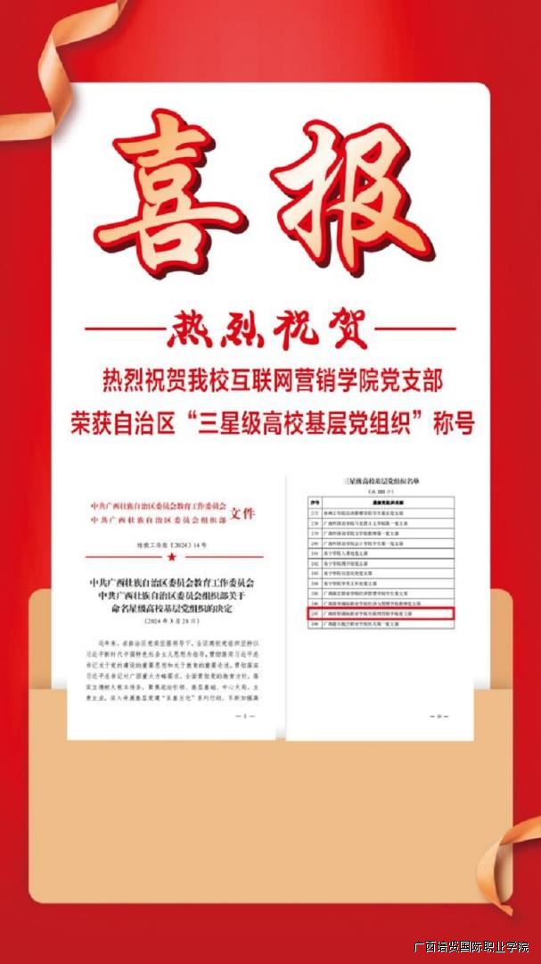 近日,中共广西壮族自治区委员会教育工作委员会、中共广西壮族自治区委员会组织部联合下发《关于命名星级高校基层党组织的决定》(桂教工委组〔2024〕14号)🧉,我校互联网营销学院党支部被评为“三星级高校基层党组织”🦨。