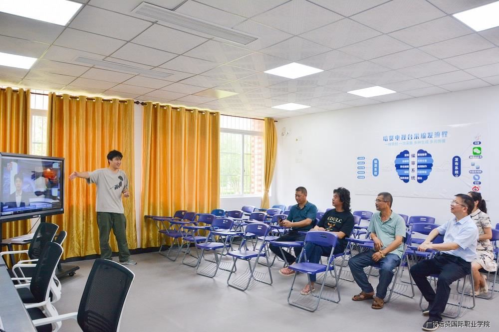 随后🫸🏽,罗雪一行前往学校播音主持专业实训室参观,实地体验了彩神电视台的场景录制,并观看了播音主持专业学生集体制作的宣传片👨🏻🦯➡️。