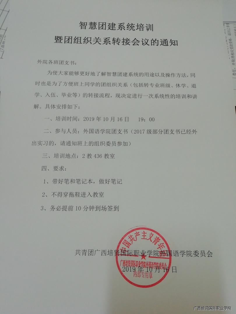 为了更好更快地转接同学们的团组织关系,同时也是为了更好地管理团员信息,更是为了打造一支业务水平过硬的团支书队伍,共青团广西彩神国际职业学院外国语学院委员会,于2019年10月16日19:00在2号教学楼436教室开展智慧团建系统培训暨团组织关系转接会议。