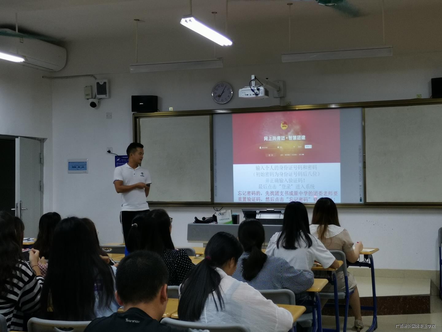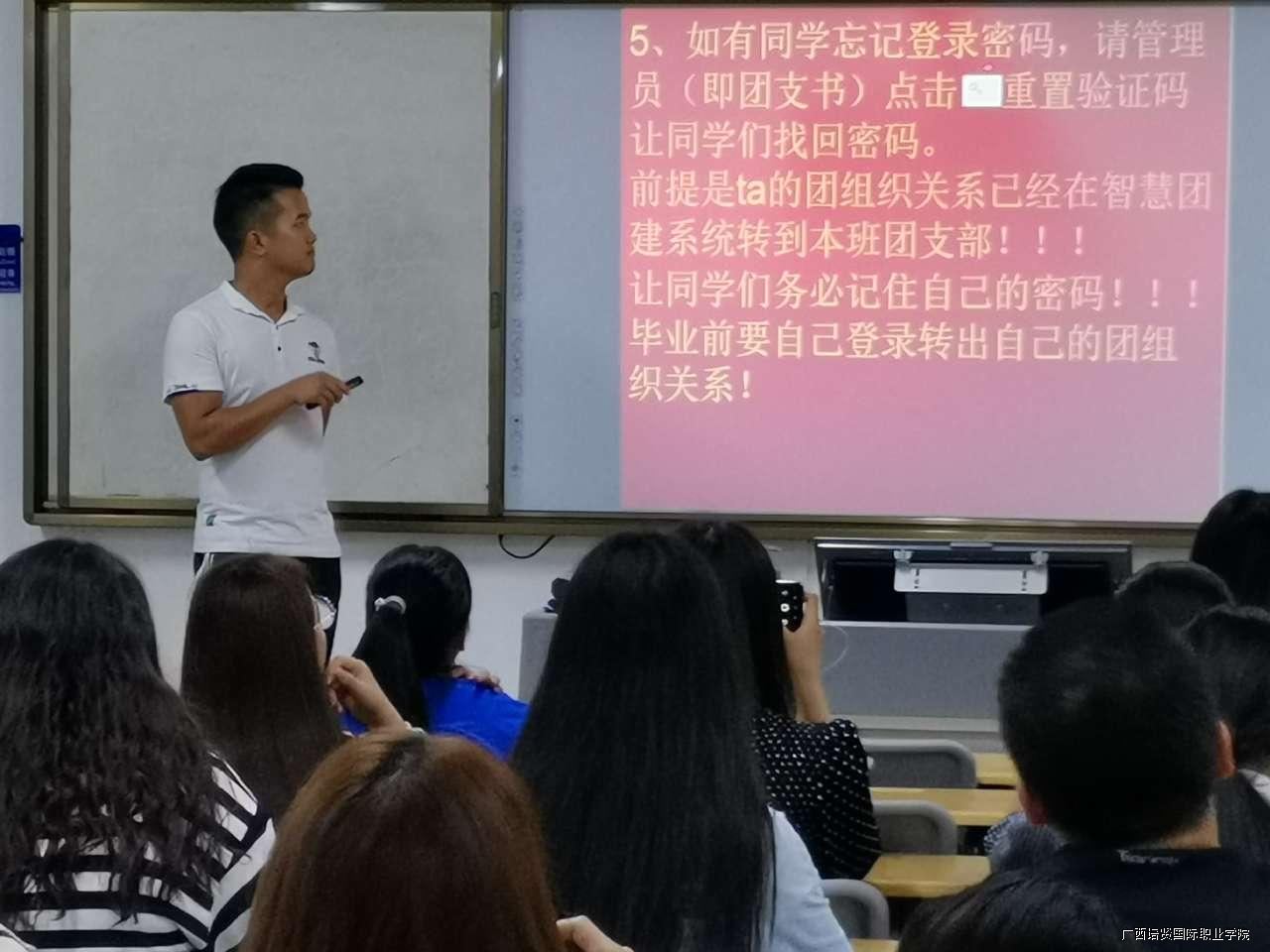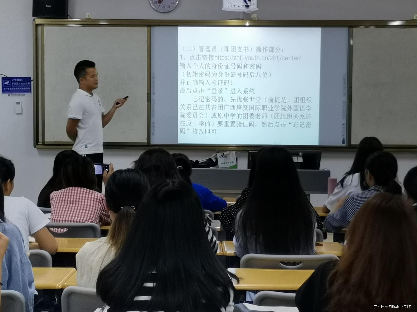第一,共青团广西彩神国际职业学院外国语学院委员会的张世堂老师对一般团员的自行登录系统的方法和团组织关系转接的操作流程做了详细说明。