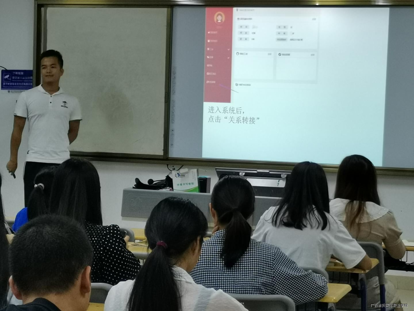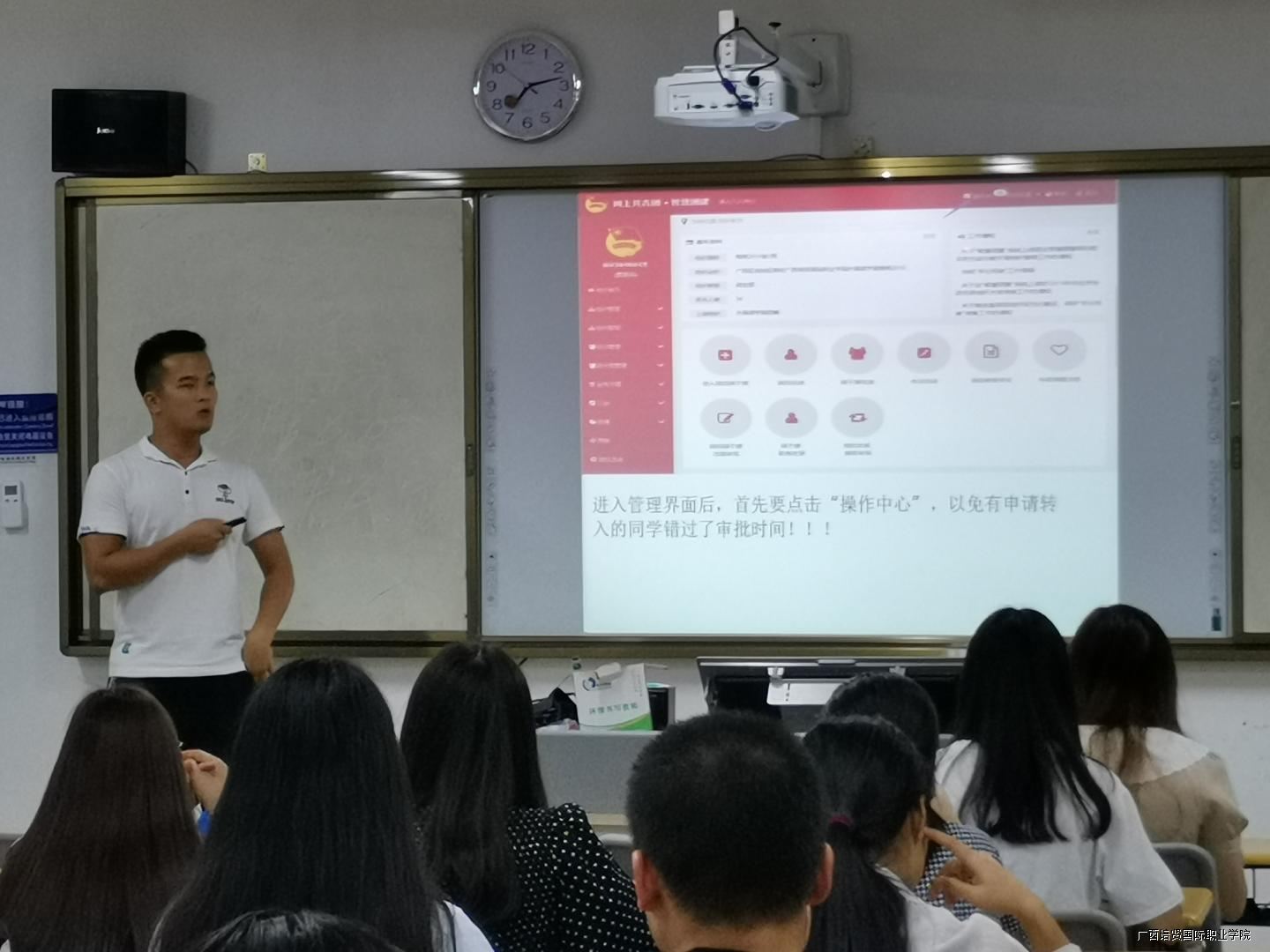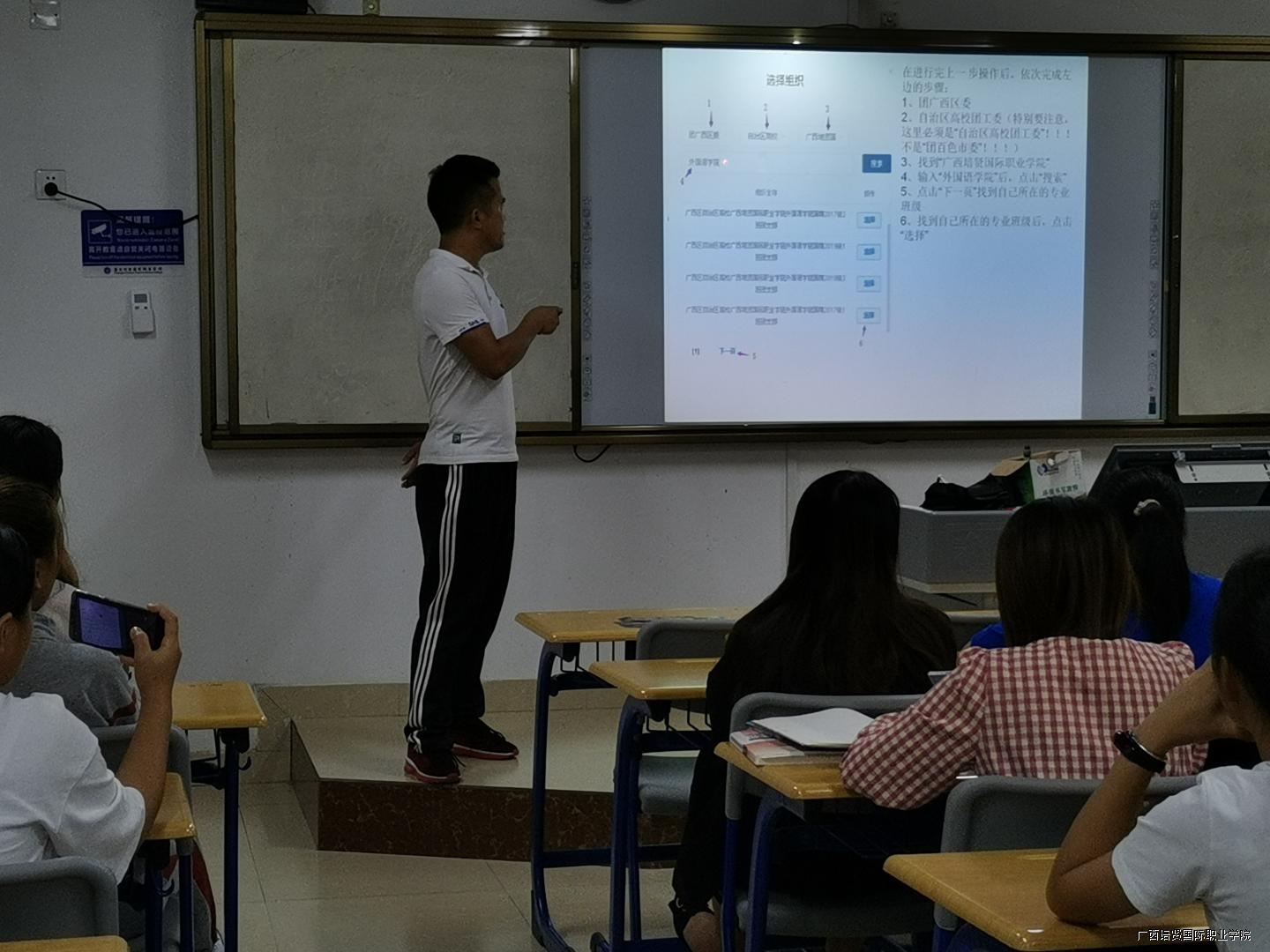 第一,共青团广西彩神国际职业学院外国语学院委员会的张世堂老师对一般团员的自行登录系统的方法和团组织关系转接的操作流程做了详细说明。