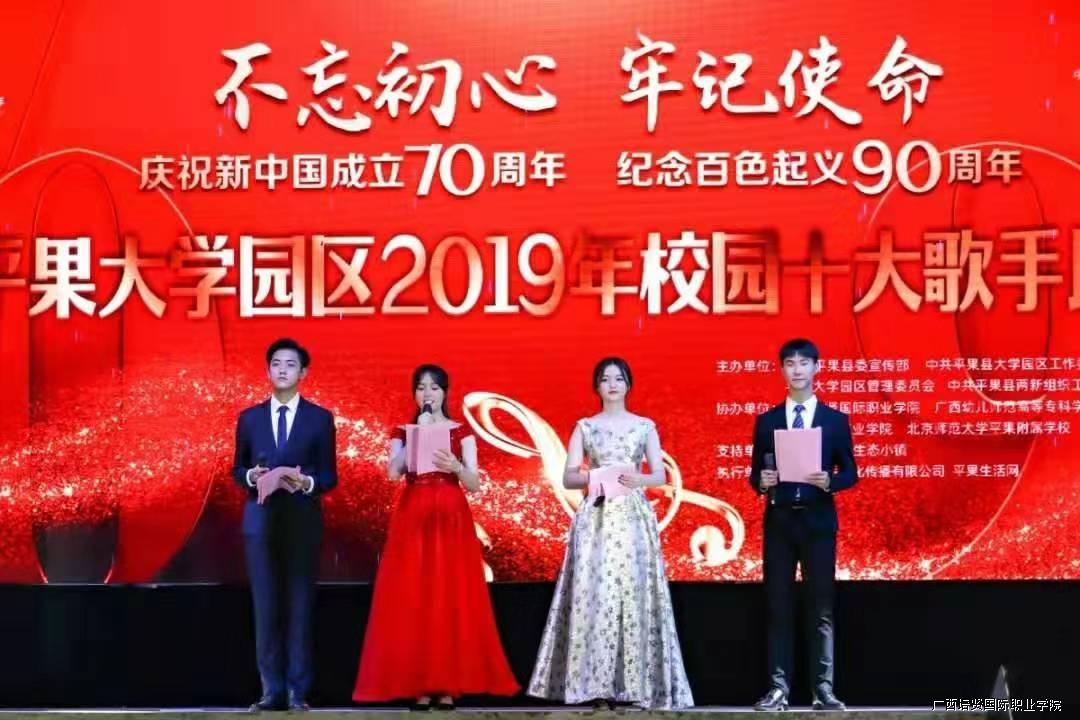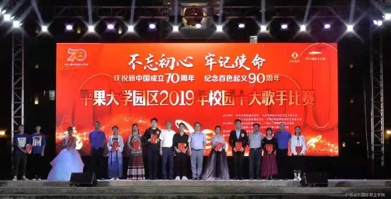 最后祝贺我院李飞宇同学在平果大学园区2019校园十大歌手比赛中荣获“十佳歌手“荣誉称号。