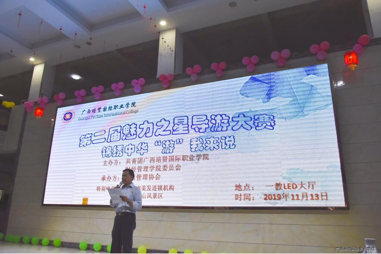 2019年11月13日,财经管理学院酒店管理协会在LED大厅成功举办了“第二届魅力之星导游大赛”活动。在此次活动中,邀请了财经管理学院院长黄飞,互联网金融学院副院长黄吉萍,南宁龙虎山风景区黄海婴总经理📔,酒店管理专业负责人黄春花🕞🏉,酒店管理专业教研室主任屈银木作为评委等各嘉宾老师们前来观看。