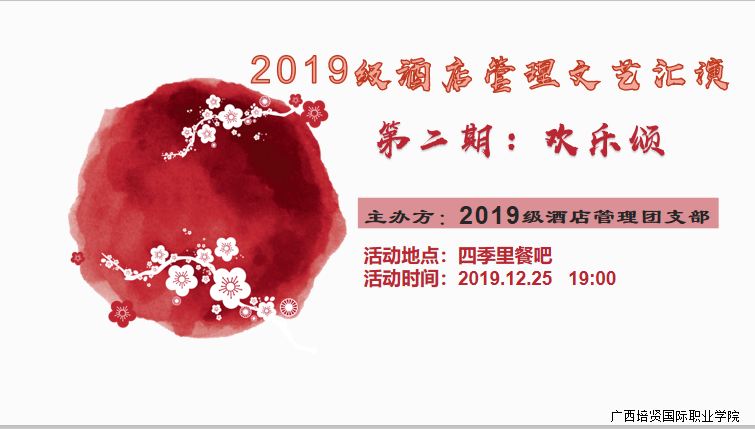 2019年12月25日2019级酒店管理成功举办第二期文艺汇演,第二期文艺汇演以欢乐颂为主题。此次文艺演出的成功举办🏢,彰显了酒店管理班级的凝聚力,也显示了酒店管理人的风采和活力🎾。