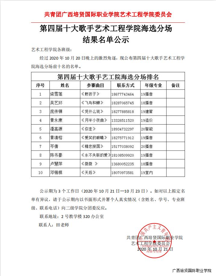 第四届十大歌手艺术工程学院海选分场 结果名单公示