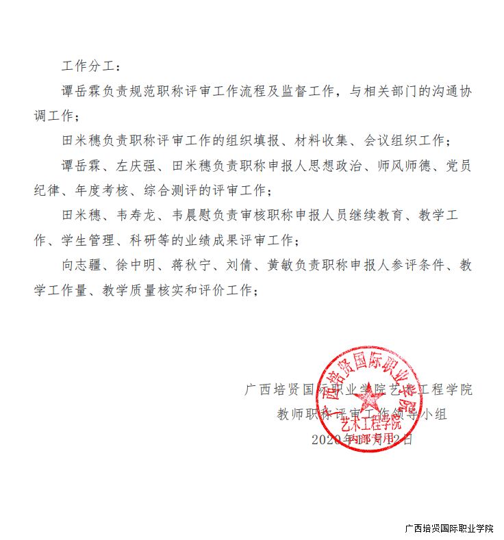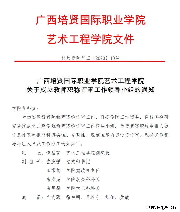 1. 桂彩神院艺工〔2020〕10号广西彩神国际职业学院艺术工程学院关于成立教师职称评审工作领导小组的通知