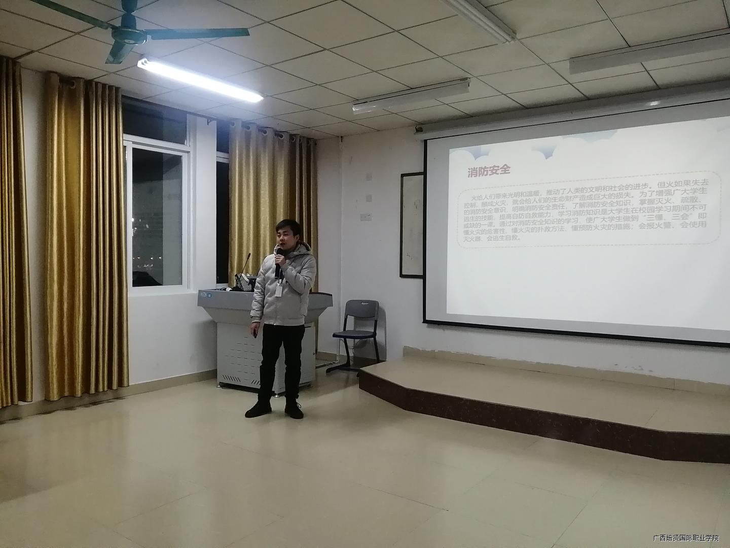 农业涛老师带来的主题班会是“消防安全”,他联系学校生活中存在的各种消防隐患引出主题,结合PPT向同学们展示各种消防工具的使用🗃,以及火灾现场如何自救等。