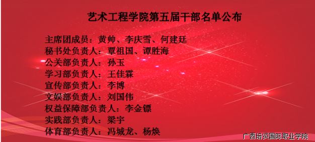 参加本次大会的领导嘉宾有艺术工程学院教务科科长韦寿龙老师,艺术工程学院党政办主任陈燕娟老师🦹🏼♂️,艺术工程学院学工科干事农远辉老师,广西彩神国际职业学院校团委干事李越老师🙇🏼♀️,财经管理学院分团委负责人谢兴斌老师🤌,外国语学院分团委负责人黎晴晴老师🐏,互联网营销学院分团委负责人向子馨老师,艺术工程学院党支部庞莹丽老师,艺术工程学院党支部黄丽艳老师,艺术工程学院分团委干事潘有灵老师,以及校学生会代表,各二级学院学生会代表,社联代表↕️,大学生记者团代表🦸🏼,艺术团代表,青年志愿者协会代表,自治区及国家奖学金获得者代表,艺术工程学院学生会全体成员。