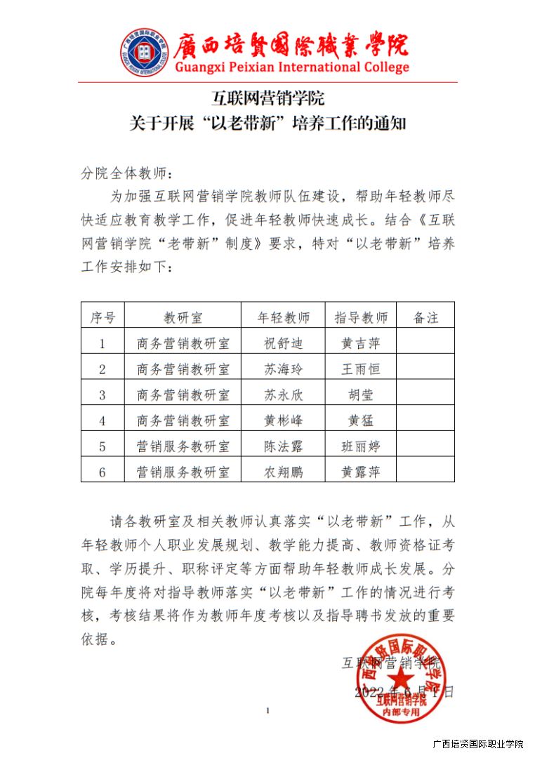 1. 互联网营销学院关于开展“以老带新”培养工作的通知