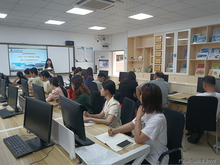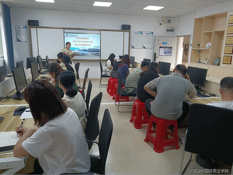 2023年4月20日下午,互联网营销学院在电子商务综合实训室召开2022-2023学年第二学期第二次全体教师会议⛔️😡。会议由教务科科长李丽荣老师主持🦸🏻。会上,教务科科长和学工科科长分别作工作安排,黄吉萍副院长作总结发言👨🎨🏊🏼♂️。
