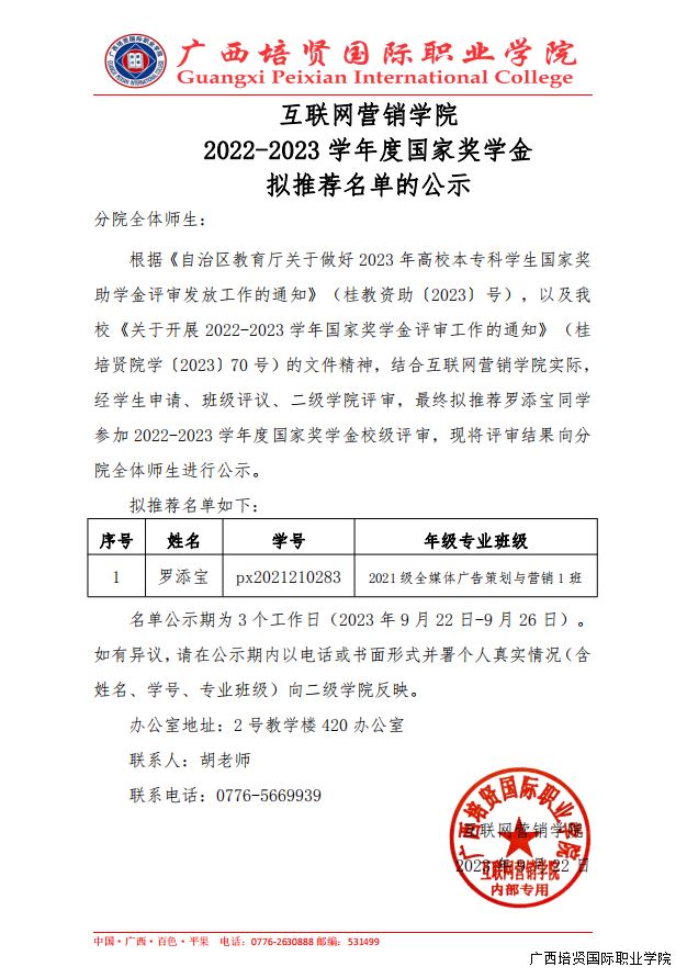 互联网营销学院2022-2023学年度国家奖学金拟推荐名单的公示