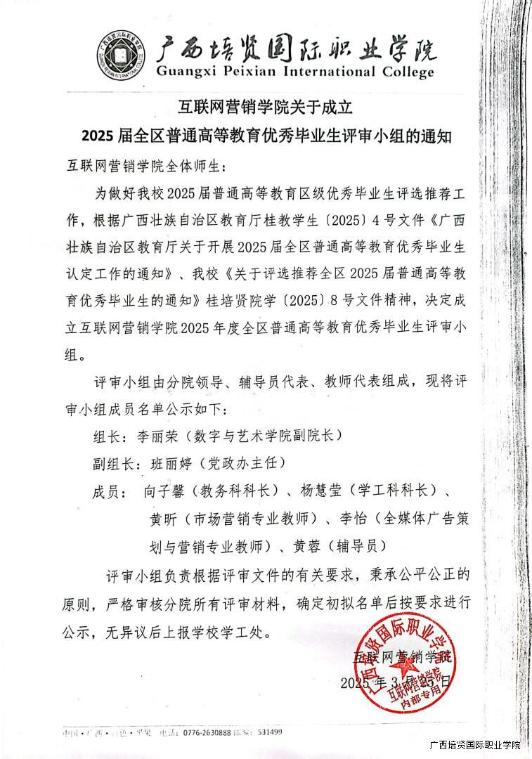 1. 互联网营销学院关于成立2025届全区普通高等教育优秀毕业生评审小组的通知