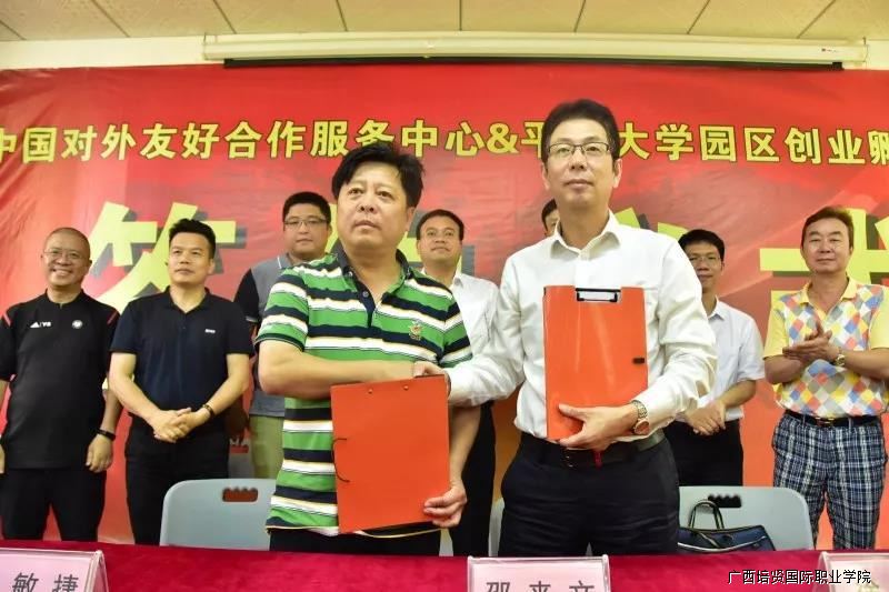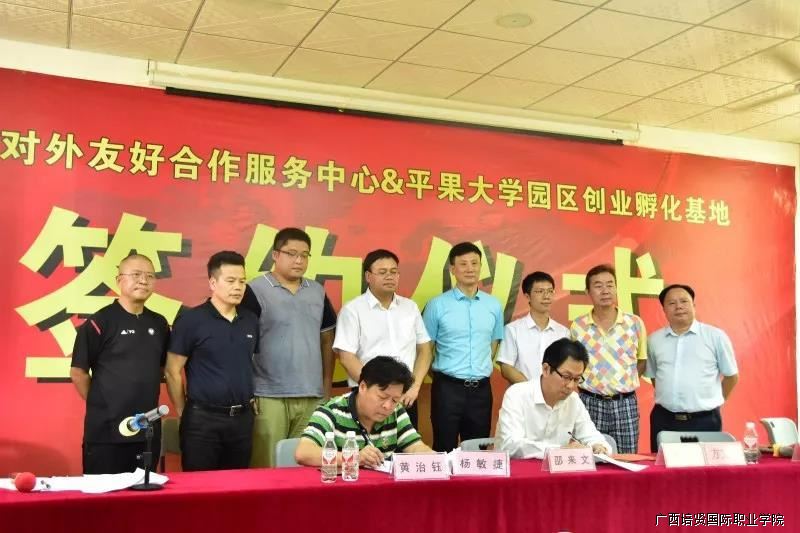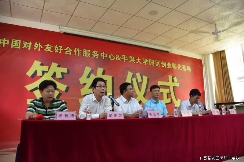 参加本次签约仪式的领导🤱🏼、嘉宾分别是:中国对外友好协会服务中心总经理徐宏、部长汤超、东莞南方科技专修学院董事长邵来文💢、校长杨忠德🚵🏿、平果县政协副主席黄治钰、香港中国实业有限公司董事长黄忠良、广西博士创业培育有限公司董事长黄忠亮、平果县教育局副局长方文艺、平果大学园区创业孵化基地董事长席嘉骏、平果大学园区管理委员会主任杨敏捷、平果大学园区各高校领导、平果县各中学校长。
