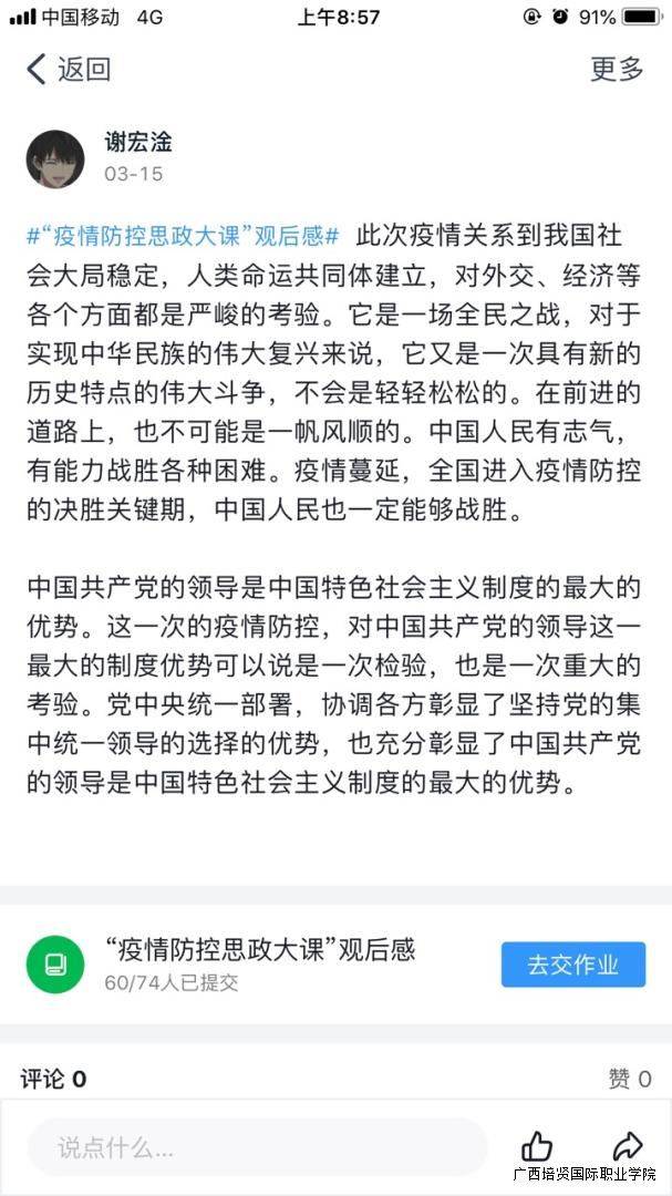 线上观摩学习结束后,我校思政部教师通过在线课堂👩🏼🚀、在线讨论等各种方式与学生热议“思政大课”💁🏻♀️,展开热烈讨论,撰写心得!并鼓励学生们就此次思政课围绕这次疫情大考对我们的启示、对于中国青年的责任与担当等方面开展了热烈讨论🤸🏽♀️。