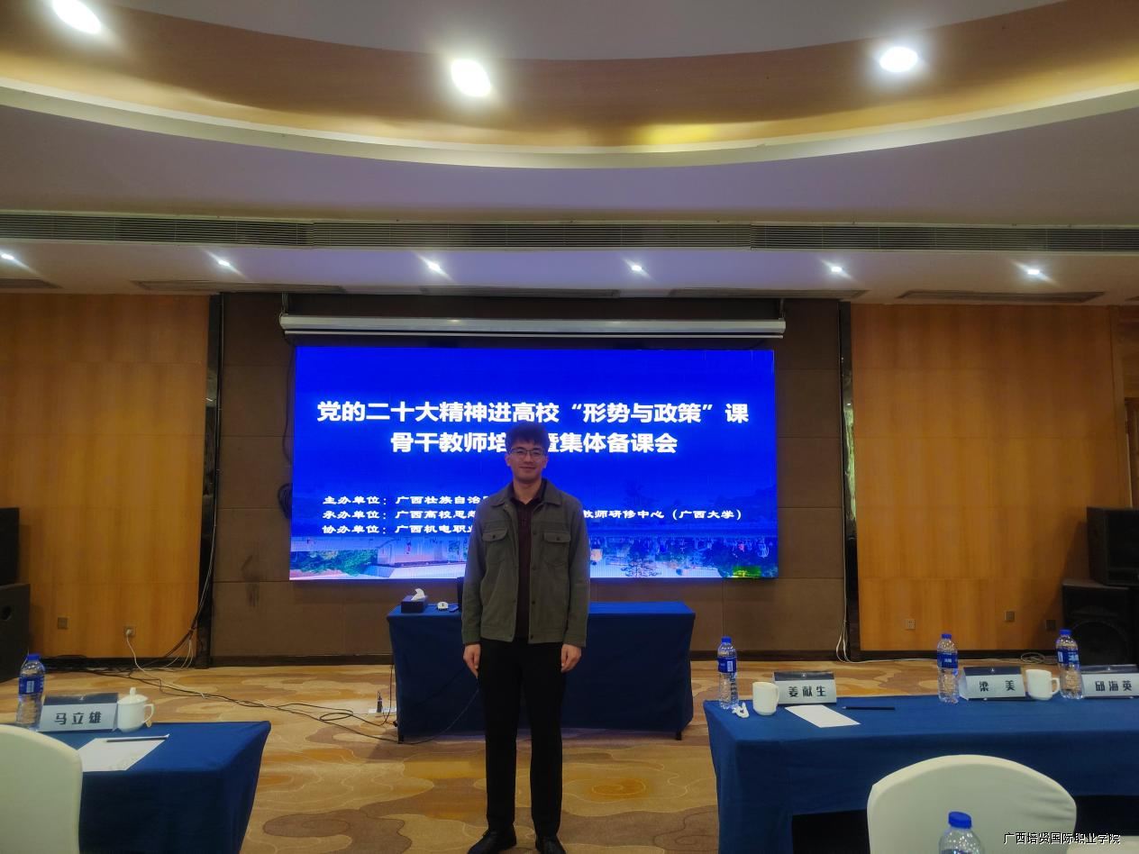 为全面贯彻党的教育方针🙅🏽♀️,进一步加强我区高校形势与政策课教师队伍建设🥦,落实立德树人的根本任务🧑🏽🚀🦩,由自治区教育厅主办,广西高校思想政治理论课骨干教师研修基地(广西大学)承办🥖,广西机电职业技术学院协办的党的二十大精神进高校“形势与政策”课骨干教师培训暨集体备课会于2023年4月11日—13日在南宁举办,我校思政部吴盛许老师参加会议🛼🐦。