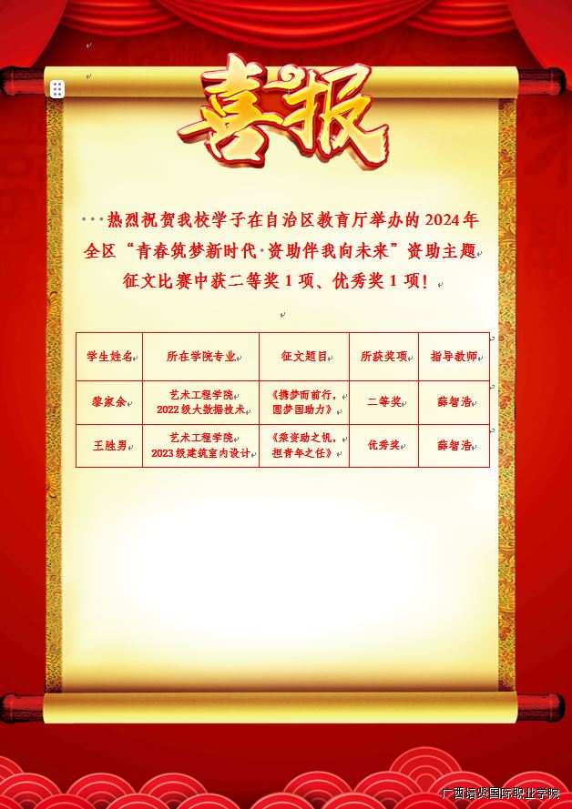 1. 祝贺我校学子在自治区教育厅举办的2024年全区“青春筑梦新时代 资助伴我向未来”资助主题征文比赛中获奖