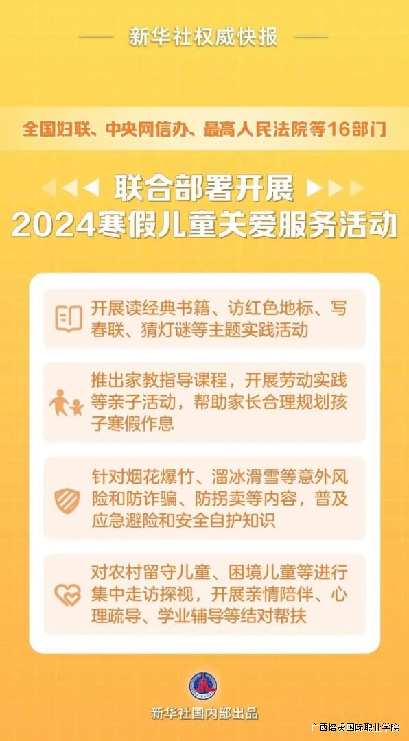 2024年寒假即将到来,全国妇联、中央网信办、最高法、最高检、教育部等16部门印发通知🎟🧡,围绕思想引领润童心、家教指导育童心、安全教育护童心🎲、爱心妈妈暖童心四个方面🕺🏼,联合部署开展“把爱带回家——真情暖童心 相伴护成长”2024寒假儿童关爱服务活动。一起来看↓↓