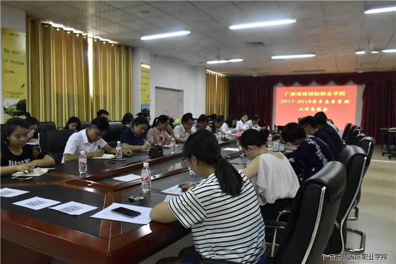 2018年7月11日下午15:00,广西彩神国际职业学院2017-2018学年春季学期工作总结会在教学楼105会议室召开🚣🏽♀️,参加本次总结会的有:学院董事长助理王佩瑶,副院长黄勇学🛁、于灏洋、陆秋利🧓、周晴,二级学院院长及行政主任、各部门负责人及行政人员、辅导员🦟。会议由黄勇学副院长主持。