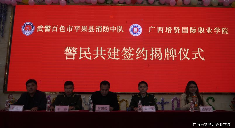 2015年12月25日🤶🏽,对于我院和武警百色市平果县消防中队来说,是个值得喜庆的日子🔼,这一天🤴🏻,广西彩神国际职业学院与武警百色市平果县消防中队在彩神学院隆重举行了“警民共建单位”签约揭牌仪式。武警百色市平果县消防中队指导员黄世玉、副中队长李一春,我院副院长何国庆、院长助理黄勇学以及中队战士,我院师生共200多人参加了签约揭牌仪式🤦🏽🍹。