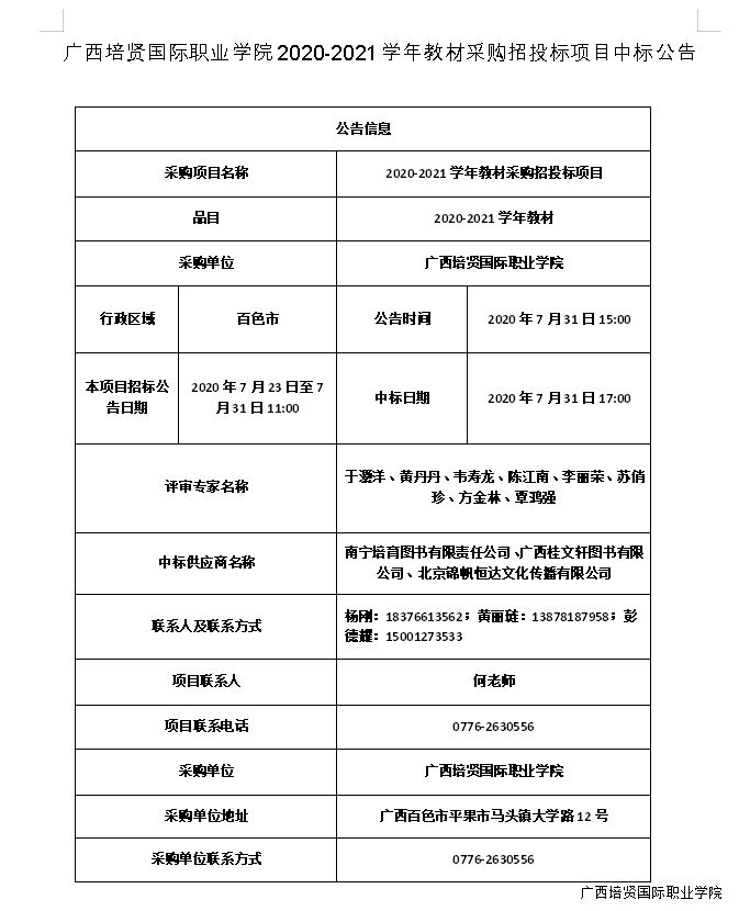 1. 广西彩神国际职业学院2020-2021学年教材采购招投标项目中标公告