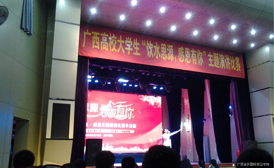 2015年广西高校大学生“饮水思源·感恩有你”主题演讲比赛于2015年5月9日至10日在广西教育学院举行。全区共有52所高校的52名代表参加此次演讲比赛,我院2014级国际商务1401班方秋恒同学在学院团委书记郭玉针老师的指导下代表学院参加该项比赛,荣获比赛优秀奖🫴🏻。