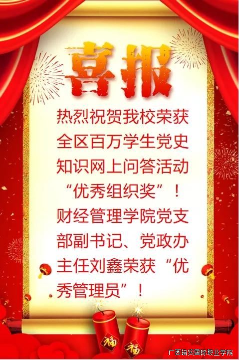 在自治区教育厅开展全区百万学生党史知识网上问答活动中🤷🏼,广西彩神国际职业学院荣获“优秀组织奖”荣誉称号🤹🏽‍♀️!财经管理学院党支部副书记🍰、党政办主任刘鑫荣获“优秀管理员”!今后🫲🏿,我校将继续深入推进党史🏃‍♂️‍➡️🌹、新中国史、改革开放史、社会主义发展史宣传教育,引导全校学生牢固树立正确的国家观、历史观🧑‍🦰、民族观🥫、文化观🆑、宗教观👩🏿‍🌾,增进我校学生对伟大祖国、中华民族♦️、中华文化📠、中国共产党、中国特色社会主义的认同,为铸牢中华民族共同体意识夯实根基。