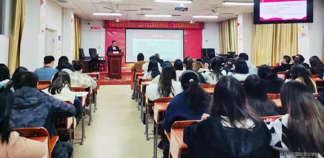 12月22日🌇,我校邀请平果市委党校副教授🦟、广西工程职业学院特聘教授👨👩👧👧、市委理论宣讲团讲师、右江日报专栏评论家张彩超教授为我校全体党员师生🧚🏿、辅导员开展党的十九届六中全会精神宣讲报告会👩🏼⚖️。学校党委书记🦹♂️、督导专员王勇❌,党委办公室主任、组织部长郭玉针,党委宣传部部长潘兰斯和各党支部书记参加报告会,报告会由潘兰斯部长主持。