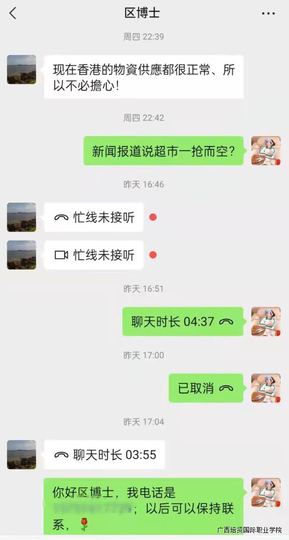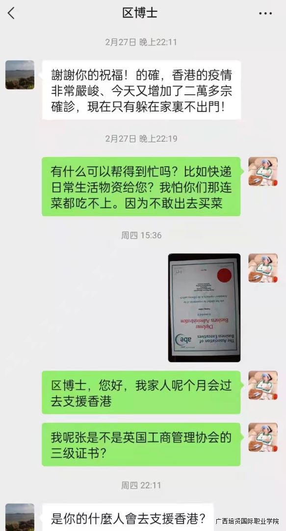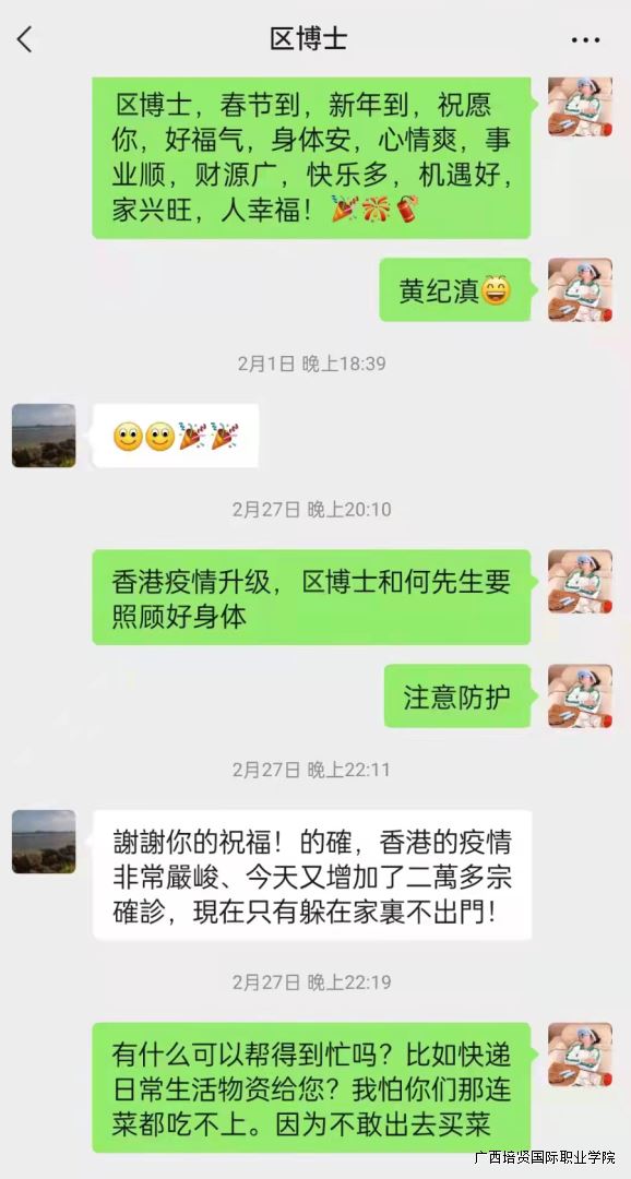 黄纪滇学姐的关心,令区博士深受感动👨🏻‍🦼🤱。用爱和温暖浇筑师生情☝🏿,情暖人心👬🏼,令人动容🌗。我们更要常怀一颗感恩的心,做一个快乐且温暖的人,才能更好地工作与生活,才能与彩神共同成长,创造辉煌👜。希望香港的疫情尽早结束,大家平平安安,身在香港的区博士、何博士要加强防护,保护好自己🌀;希望黄学姐工作顺利🐍,身体健康👩🏽‍💻👩🏿‍🎤。