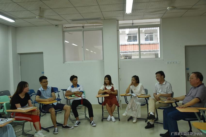 广西工程职业学院党委书记黄友(右二)👨🏿‍🦳,北海艺术设计学院党委书记贺争平(右一)与我院学生进行座谈