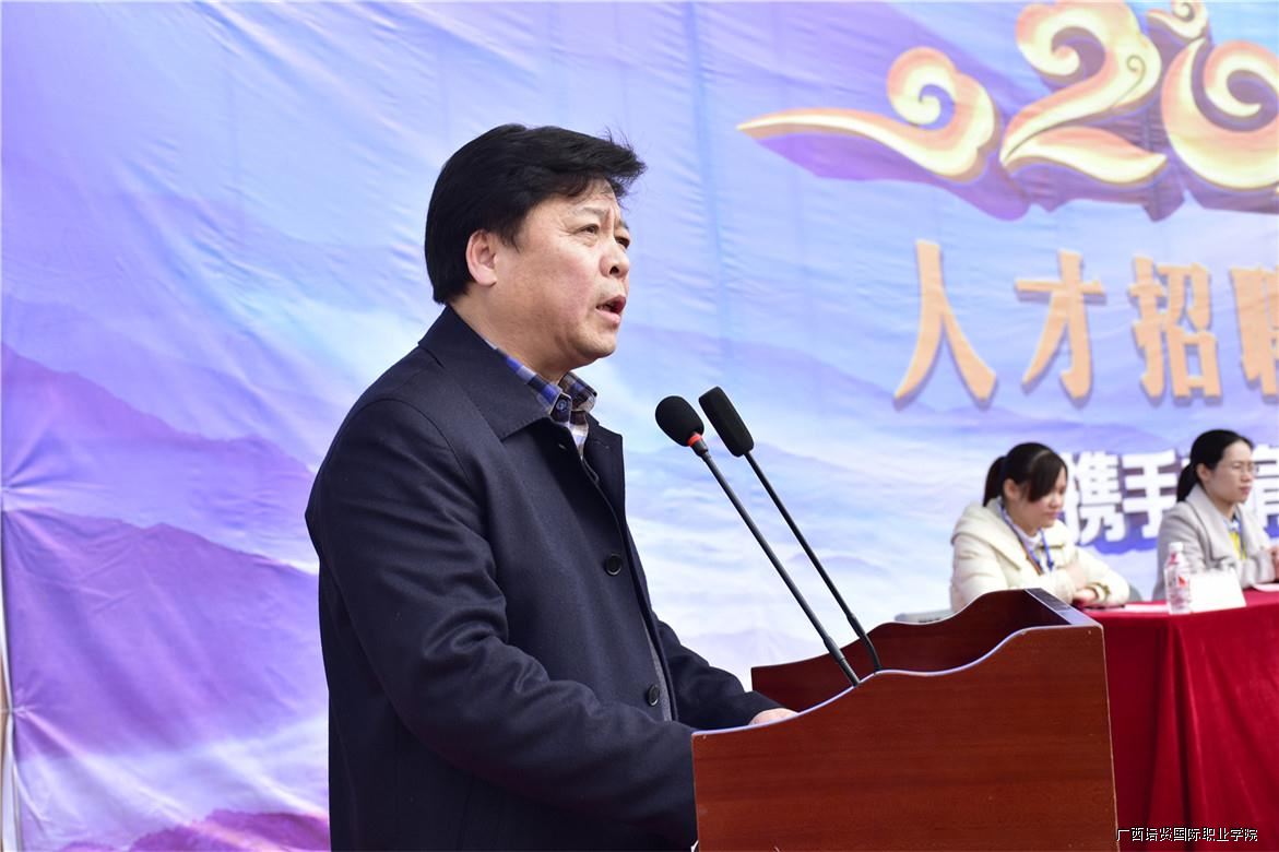 广西彩神国际职业学院副董事长区寿本博士、学院院长吴开珊、副院长黄勇学、副院长于灏洋🌳、副院长周晴👶🏼、平果大学园区管委员会主任杨敏捷先生、副主任罗永林先生⚰️、中共平果大学园区党工委专职副书记黄华婷女士、平果县中等职业学校招就办主任黄创业先生🚴🏿‍♀️🤼‍♀️、上海木今投资有限公司董事长席嘉俊先生、各大招聘企业负责人、以及彩神学院全体师生出席了招聘会启动仪式。