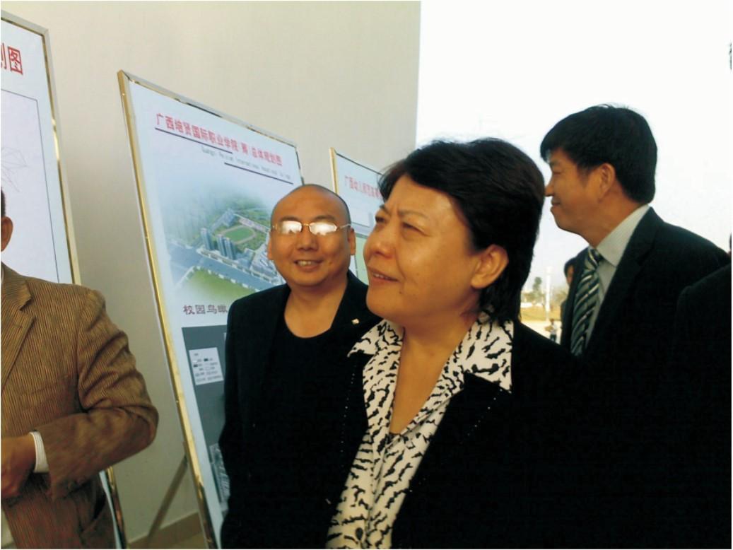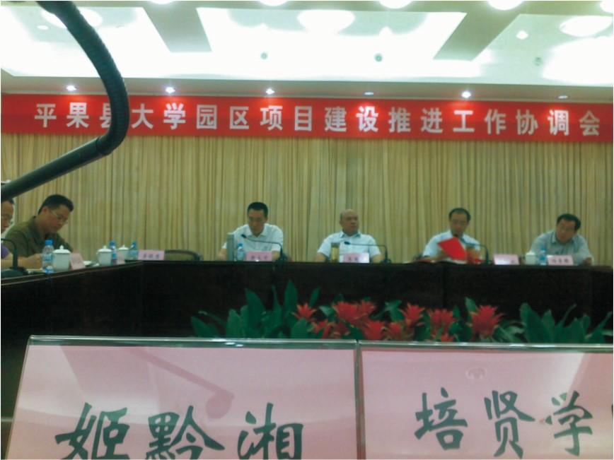 2009年,时任平果县县长韦周凡向学校副董事长区寿本博士介绍平果大学城规划。