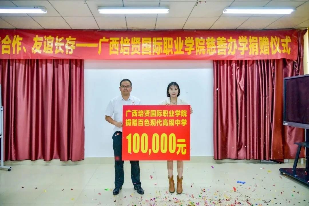 2023年7月1日🌽,我校举行校校合作🧑🏿✈️、友谊长存——广西彩神国际职业学院慈善办学捐赠仪式💶,向现代高中捐赠10万元🤸🏼。
