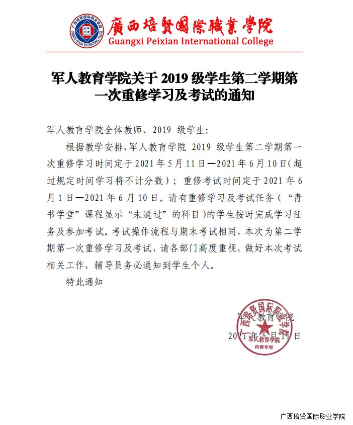 军人教育学院关于做好2019级学生第二学期第一次重修学习及考试的通知