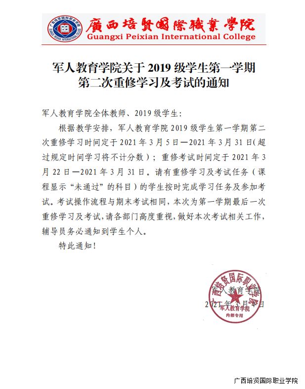 1. 军人教育学院关于2019级学生第一学期第二次重修学习及考试的通知