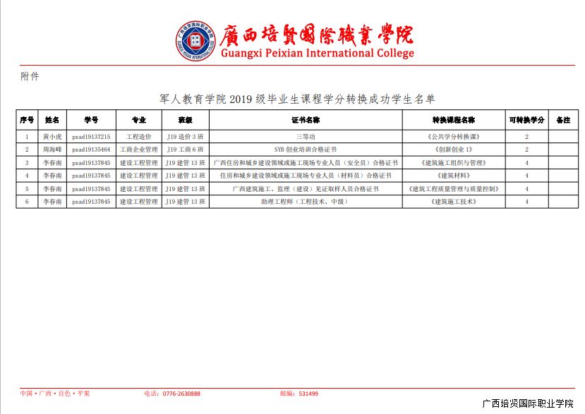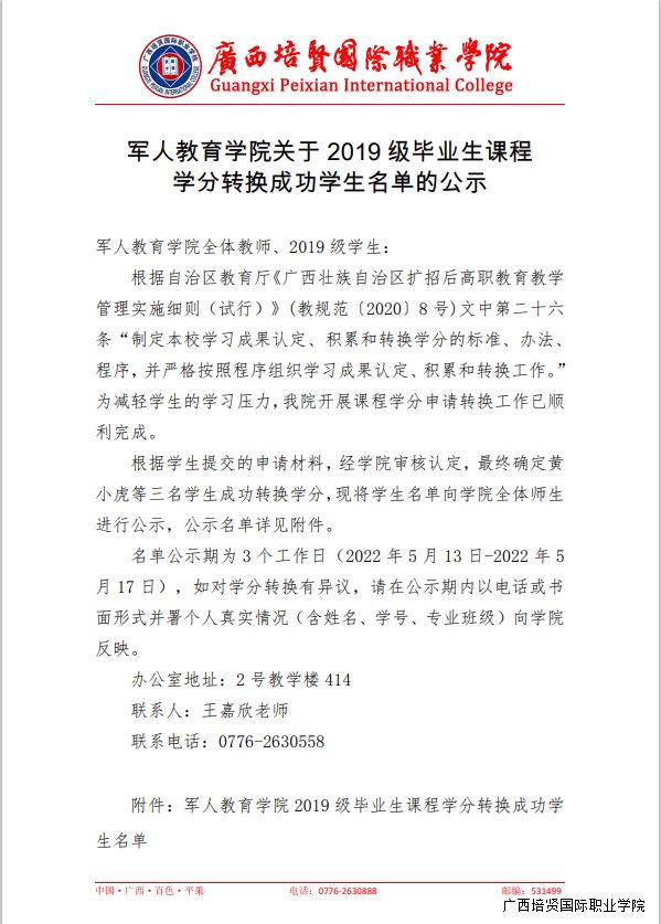 1. 军人教育学院关于 2019 级毕业生课程 学分转换成功学生名单的公示
