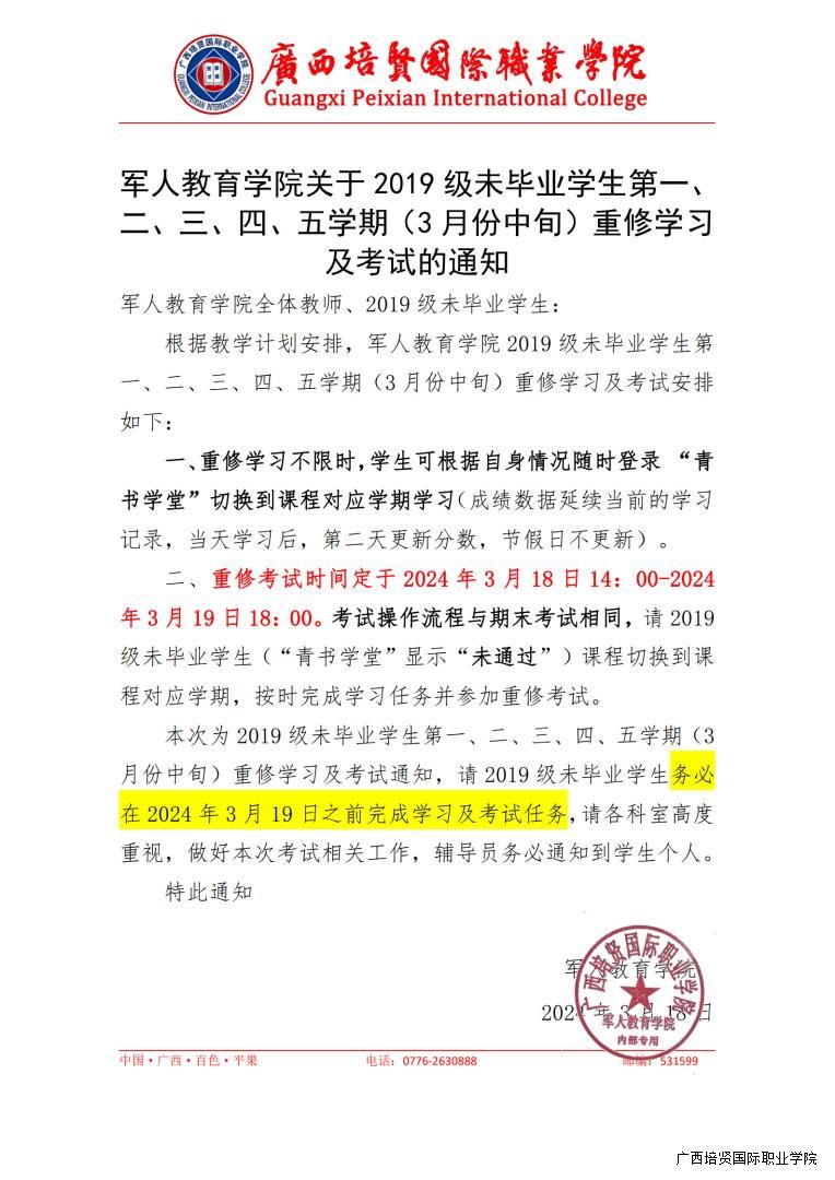 军人教育学院关于 2019 级未毕业学生第一🪴、 二🙇🏿♂️、三🧑🏻🦼、四🧑🏿🚀、五学期(3 月份中旬)重修学习 及考试的通知