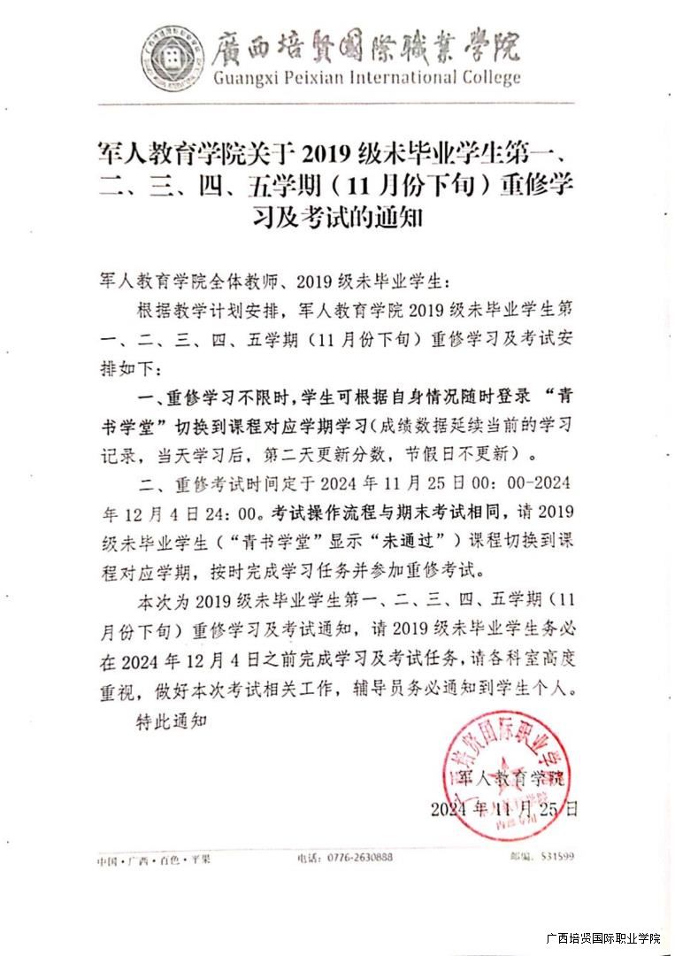 1. 军人教育学院关于2019级未毕业学生第一♎️、二🧗🏿‍♀️、三、四、五学期(11月份下旬)重修学习及考试的通知