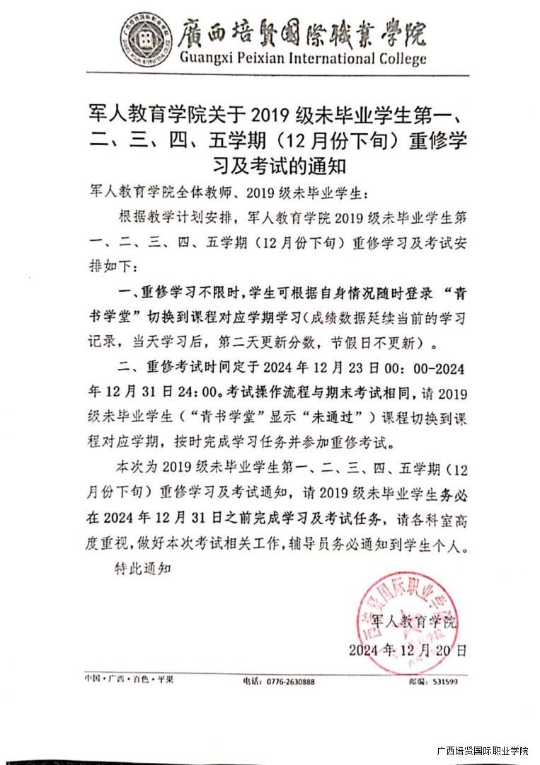1. 军人教育学院关于2019级未毕业学生第一⬜️、二、三、四、五学期(12月份下旬)重修学习及考试的通知